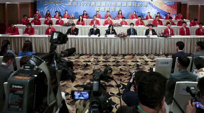 12月3日,内地奥运健儿代表团到达香港后在海景嘉福酒店举行媒体见面会,介绍访问香港的行程,并与媒体交流互动。新华社记者 贾浩成 摄
