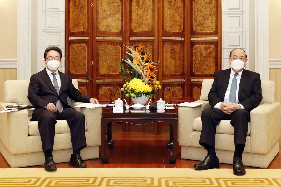 澳门特别行政区行政长官贺一诚23日在政府总部与天津市副市长朱鹏一行会面,双方就进一步促进津澳交流与合作交换意见。