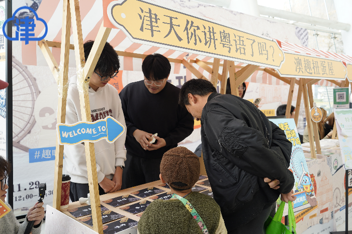 文化推广活动精心策划一大核心比赛与六大特色摊位。“津澳共创”——吉祥物插画及周边设计比赛,津澳两地学生结对踊跃参赛,融合澳门、天津元素与津澳联品牌形象展开创作,设计吉祥物插画。“彩绘葡韵 瓷忆澳门”摊位,市民用彩色小瓷砖拼绘图案,感受瓷砖背后的澳门特色历史文化;“津,彩葡韵拼贴画”摊位,通过纹案描绘互动,让动手乐趣与文化认知巧妙融合;“葡语小课堂”摊位,工作人员讲解“你好(Olá)”“谢谢(Obrigado/a)”等基础词汇;“津天你讲粤语了吗?”摊位,通过普通话、天津话、粤语卡片配对,让方言学习充满乐趣。现场还设置了“集章换礼”扭蛋机,市民可在各摊位完成互动获取印章,集满指定数量即可兑换限量纪念品。