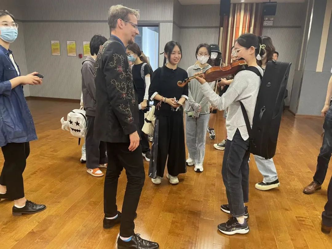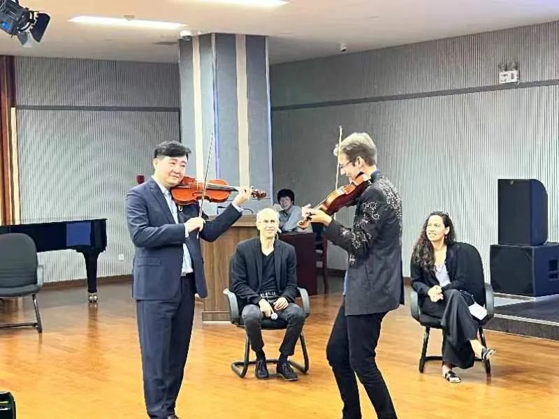 在天津音乐学院,一场主题为“中美小提琴家的对话”交流活动精彩呈现。天津市对外友协副会长黄春艳、天津音乐学院副院长唐悦奇出席活动,天津音乐学院管弦系副主任、小提琴教授宋强等青年教师与迪灵汉姆同台切磋音乐技艺,中美艺术家与参加活动的天津音乐学院师生60余人共叙音乐之美、共话中美友谊,共上一堂精彩的“音乐外交”公开课。活动现场,迪灵汉姆介绍了美国乡村流派的小提琴演奏特点和技巧,演奏了美国民间传统小调和中国曲目《月亮代表我的心》。特别值得一提的是,这位被誉为“俄克拉荷马州音乐大使”的小提琴家专门为中国之行创作了一首《老朋友》,将中国古典音乐的五声调式与美国乡村音乐进行了巧妙融合,尽显中西音乐和谐共融之美。宋强教授演奏了中国小提琴经典曲目《梁祝》(选段),起承转合、独具韵味的东方古典旋律和其中蕴含的中国传统文化内涵令3位美国艺术家沉醉其中、连连称赞。中美两位小提琴家现场即兴合奏并互赠中美曲目乐谱,将此次中美人文交流活动推向高潮。迪灵汉姆还与到场学生积极互动,结合自身经历讲述音乐作为沟通对话的有效媒介带给人们的美好和力量。同学们纷纷表示,这堂生动的大师课,为他们打开了一扇崭新的艺术之窗,也让他们亲身体会到中美人文交流传递出的启迪心灵、沟通情感的正能量。
