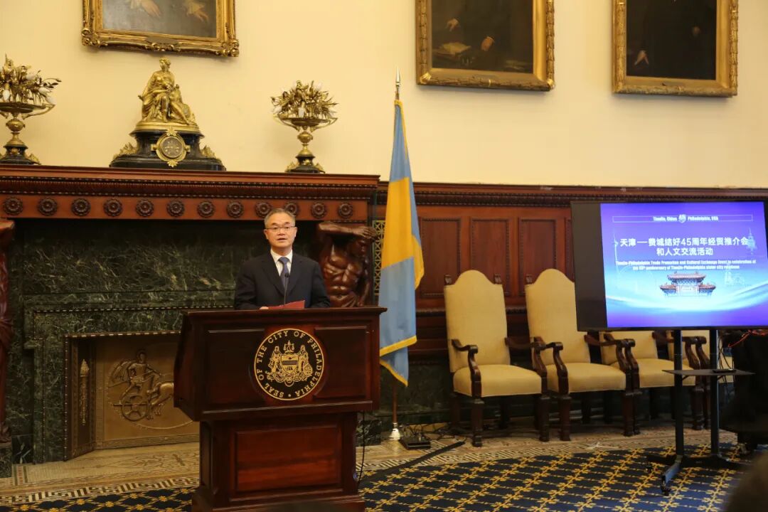 天津市常务副市长刘桂平在致辞中表示,中美两国建交不久,天津与费城就建立了友好关系。45年来,两市友好往来风雨无阻、历久弥坚,在经贸、教育、人文等方面开展了卓有成效的交流与合作。未来,希望双方加强政府间交流,拓展经贸往来,推动港口合作,促进人文交流;积极开展高等教育和青少年领域的交流合作,举办青少年研学互访等多姿多彩的交流活动,让天津与费城成为中美友城间人文交流的典范。