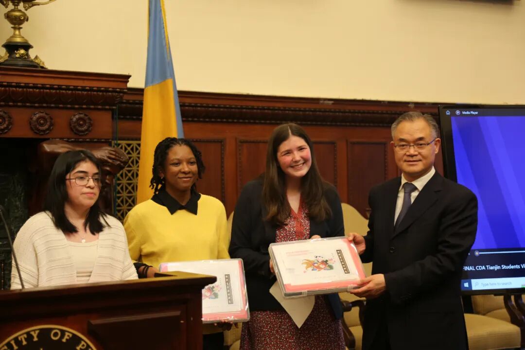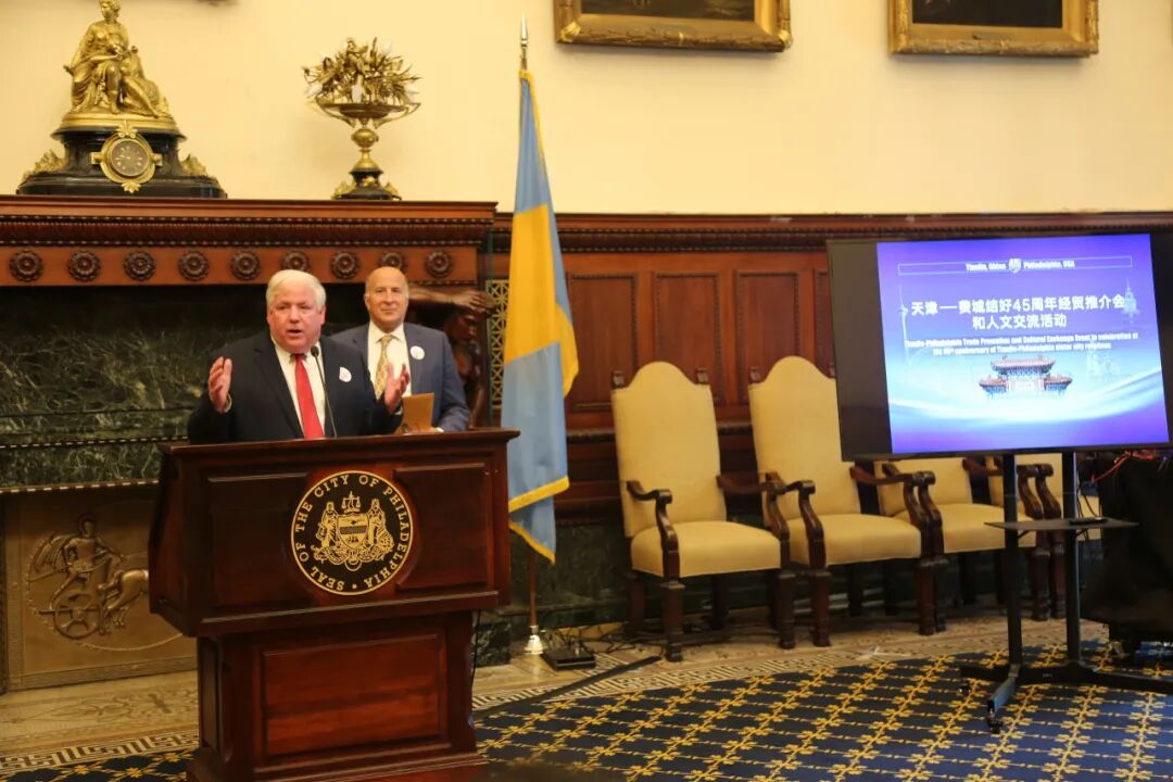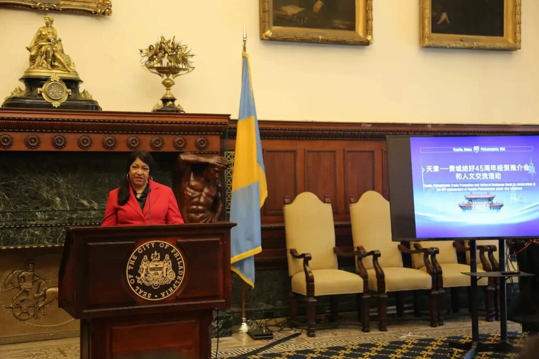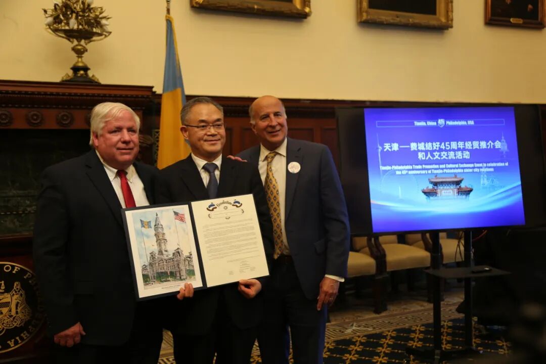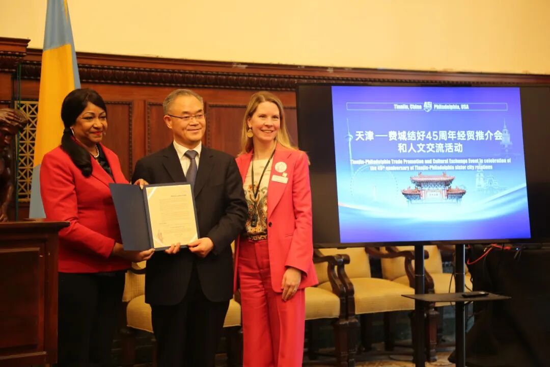 当天,费城市议会代表现场宣读决议,庆祝天津代表团到访和双方结好45周年。费城市长切蕾尔·帕克签署声明,宣布当日为天津友城日。