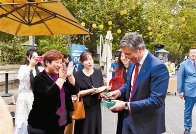 里斯市长对中国文化十分感兴趣,他品尝了达仁堂药食同源的饮品,聆听了杨柳青木版年画中的故事,在曾氏津派盘扣技艺的点位前,他对传承人邢晋说:“这些都是你做的吗?太美了,太棒了!”当得知里斯市长有三个女儿时,邢晋赠送给孩子们三枚小小的蜻蜓盘扣胸针,“谢谢你!”里斯市长用中文致谢,现场响起一片笑声。