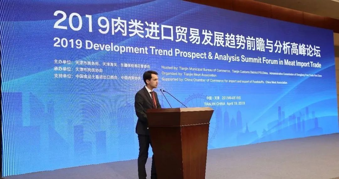 Since the change of office term in 2018, the Association has given full play to the dominant position of the Port of Tianjin for the meat trade, which has promoted the coordinated development of the Beijing-Tianjin-Hebei region. It has made active efforts to facilitate foreign exchanges and cooperation in the meat industry, invite overseas superior resources while making quality Chinese resources go global, and organize foreign exchanges in various dimensions and academic exchanges and seminars between domestic and foreign industries. To enlarge the influence and effect of Tianjin's meat trade and grasp the status quo and future development of the international meat industry, the Association organizes the annual Summit Forum on the Development Trend of Meat Import Trade (Forum for short), inviting agricultural counselors of major meat exporting countries, and Chinese and foreign industry experts, counterparts, and meat distributors to have in-depth discussions around the hot and difficult issues of the industry development, so as to find relevant countermeasures. The 2019 Forum, which was held in Tianjin Meijiang Convention and Exhibition Center, was attended by about 300 guests from meat associations of France, Finland, Uruguay, the United Kingdom, and the United States, and Meat & Livestock Australia, French Interprofessional Pork Council (INAPORC), China Meat Association, China Chamber of Commerce of Import & Export of Foodstuffs, Native Produce & Animal By-Products, meat associations of Chinese provinces/cities, industry experts and famous enterprises including Shuanghui, Beijing Capital Agribusiness & Food Group, Hengchao International, and ADP Tianjin International Transportation Co., Ltd. It organized in-depth discussions on the opportunities and challenges of international meat development under the background of "dual circulation" in the post-pandemic era and on facilitating the development of Tianjin as an international consumption center city.