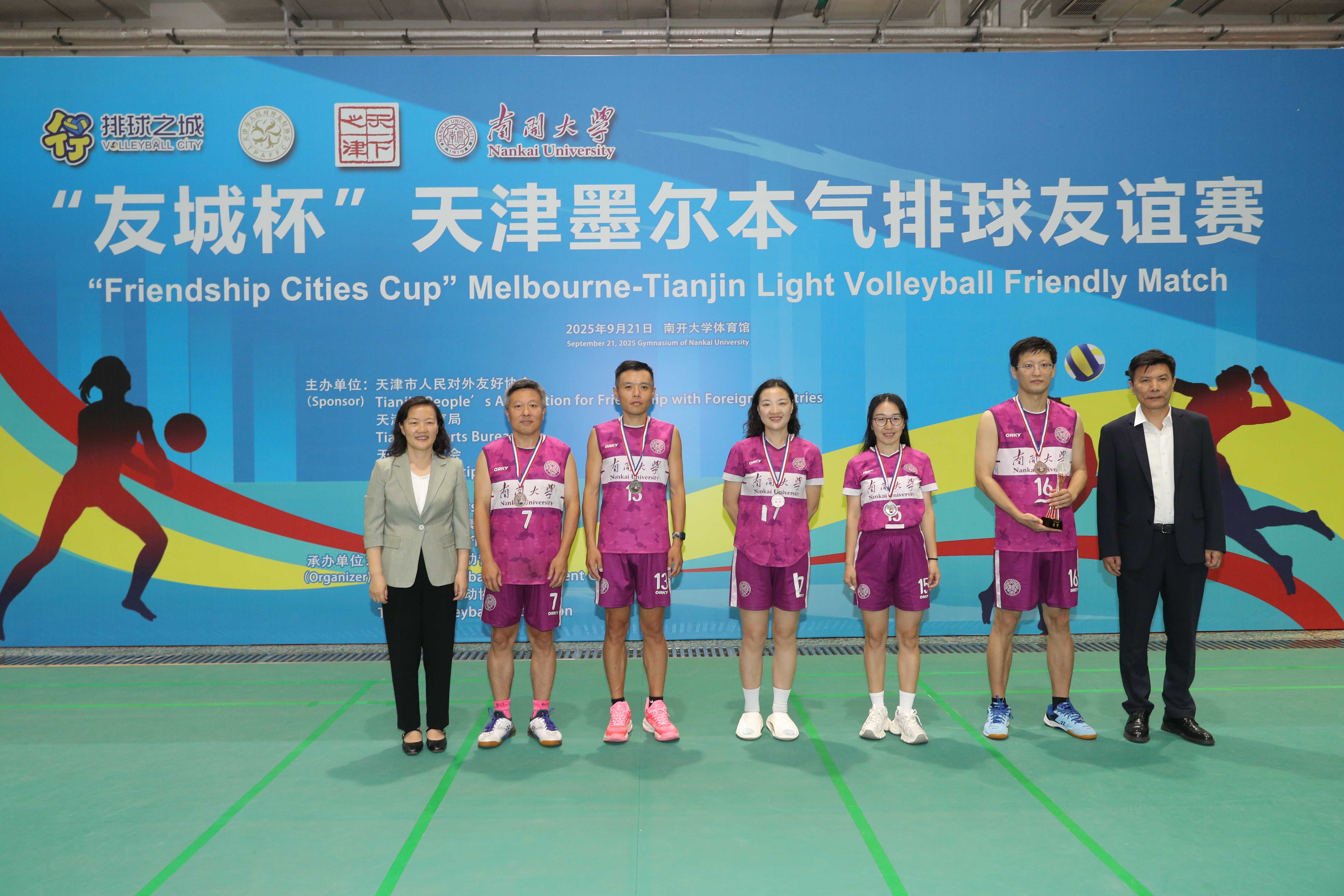 今年是天津与澳大利亚墨尔本市缔结友城45周年。为促进两市友好关系,9月21日,2025“友城杯”天津墨尔本气排球友谊赛在南开大学体育馆成功举办。此次活动由天津市对外友协、天津市体育局、天津市总工会、南开大学、墨尔本天津代表处主办,天津市排球运动管理中心、天津市排球运动协会承办,来自澳大利亚的墨尔本气排球队、南开大学教职工气排球队、天津市职工气排球队、天津星海联盟气排球队参加比赛。澳大利亚墨尔本市市长里斯,墨尔本市议员雷示人、廖婵娥、刘乐及墨尔本市相关人员;南开大学校长陈雨露,副校长方勇纯,市外办主任、市对外友协副会长栾建章,市对外友协副会长黄春艳及南开大学师生等约600余人参加活动。