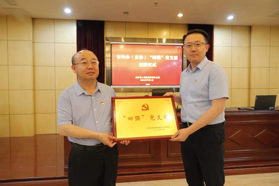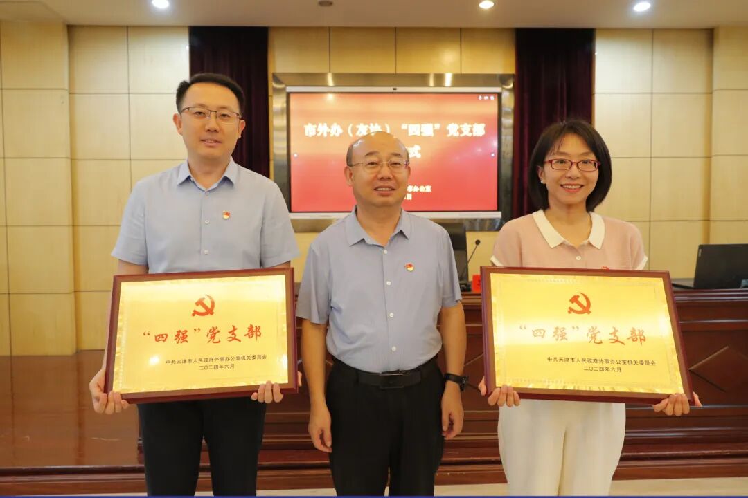 会议宣读了命名“四强”党支部的决定。栾建章同志为“四强”党支部外事管理处党支部和美大处党支部授牌。两名党支部书记围绕如何发挥支部战斗堡垒作用服务保障天津外事工作高质量发展作交流发言。