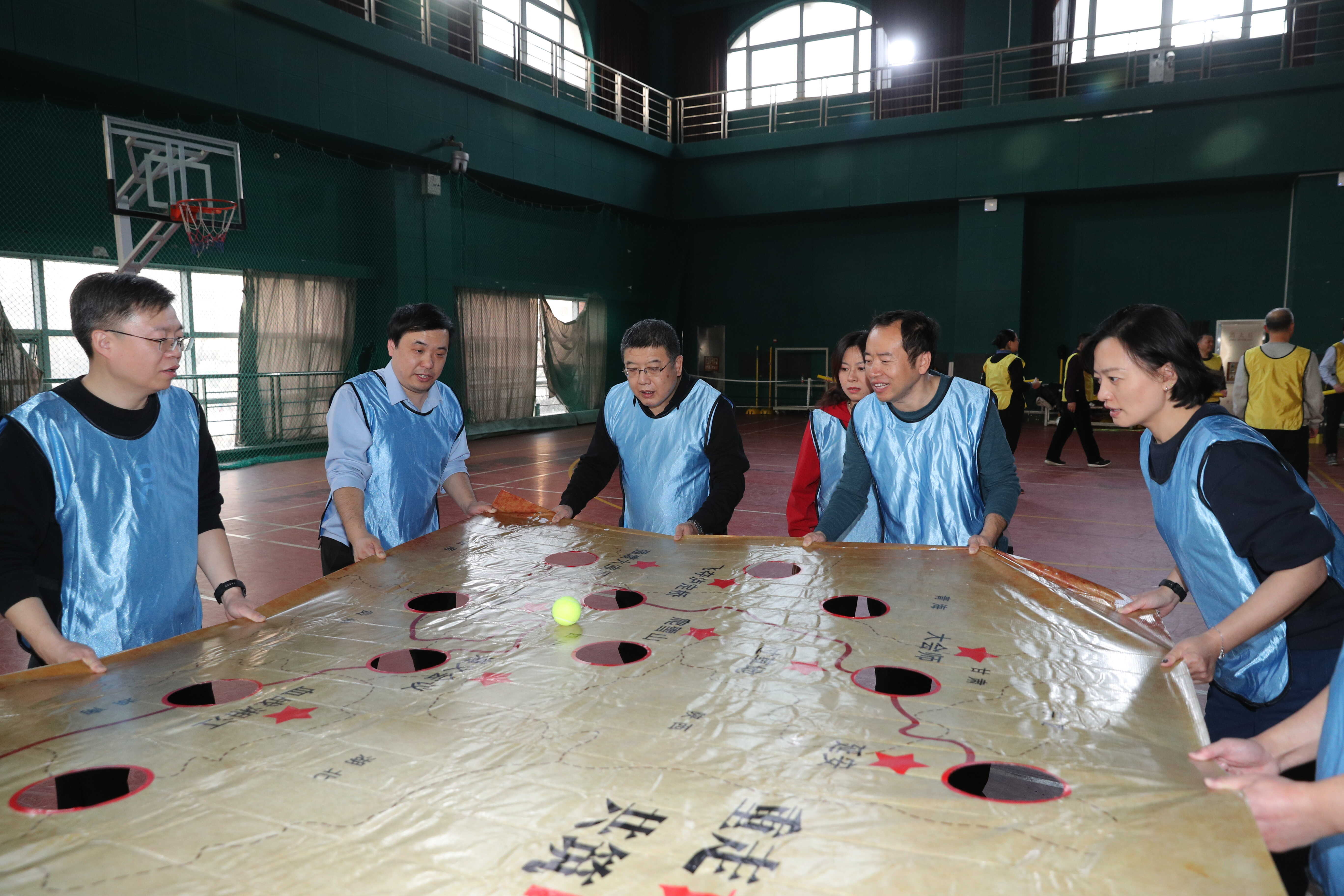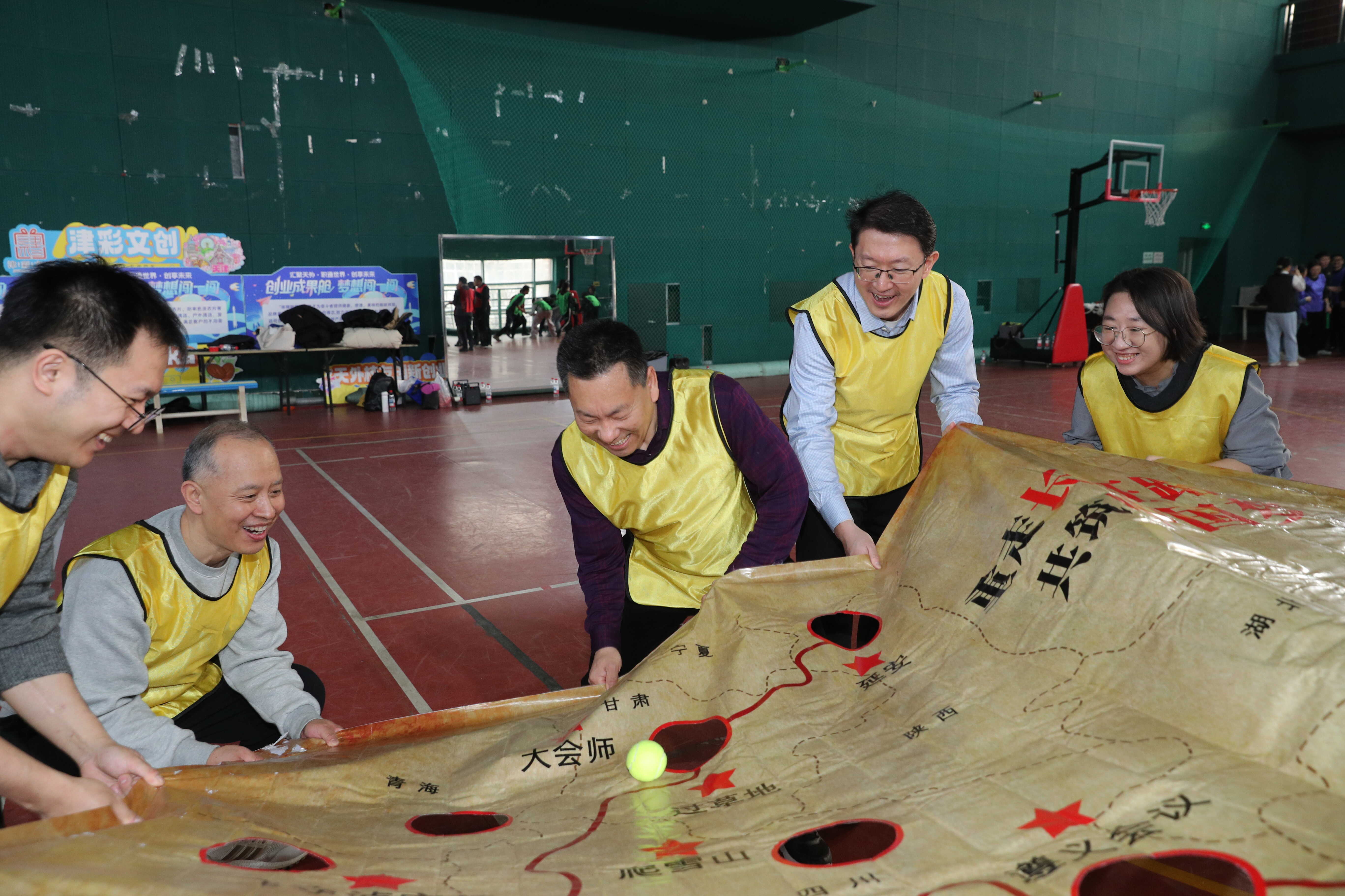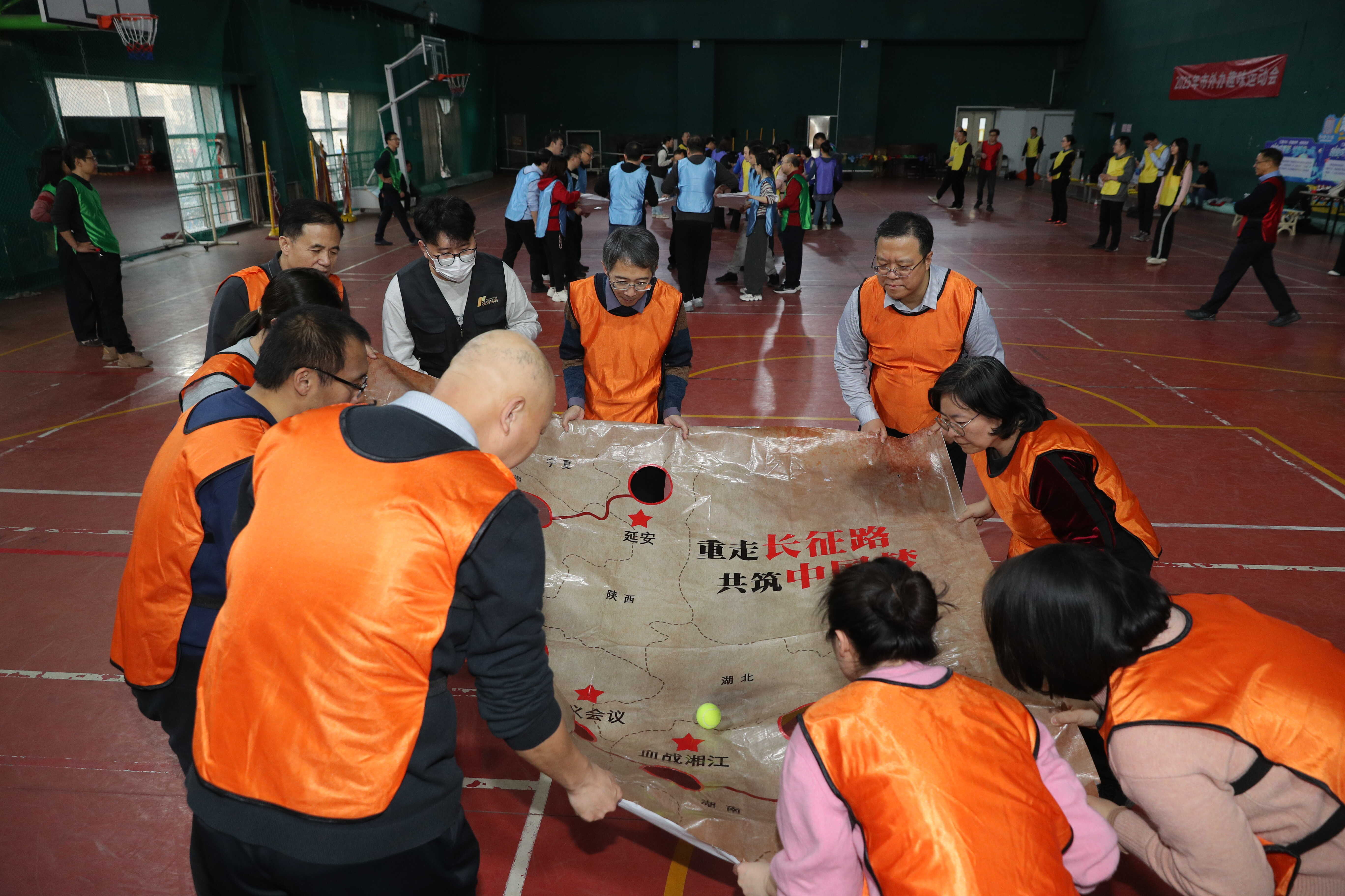 本次运动会以“凝聚、团结、欢乐”为核心,精心设置了合力建塔、鼓面颠球、重走长征路、珠行天下等趣味竞技项目。赛场上,各参赛队伍默契配合、奋勇争先。合力建塔环节中,队员们精准操控绳索,稳稳吊起积木层层堆叠,每一块积木的成功安放,都是团队协作的生动体现;鼓面颠球考验着团队的节奏把控,队员们拉紧绳索、紧盯彩球,一次次颠起的不仅是篮球,更是齐心协力的默契;重走长征路项目里,大家紧握布边,小心翼翼护送网球穿越“长征节点”,在重温红色记忆的同时,体会着团结协作的真谛;珠行天下项目则要求队员们快速衔接球槽、稳步传送小球,紧张又欢乐的比拼引得现场笑声阵阵、喝彩连连。