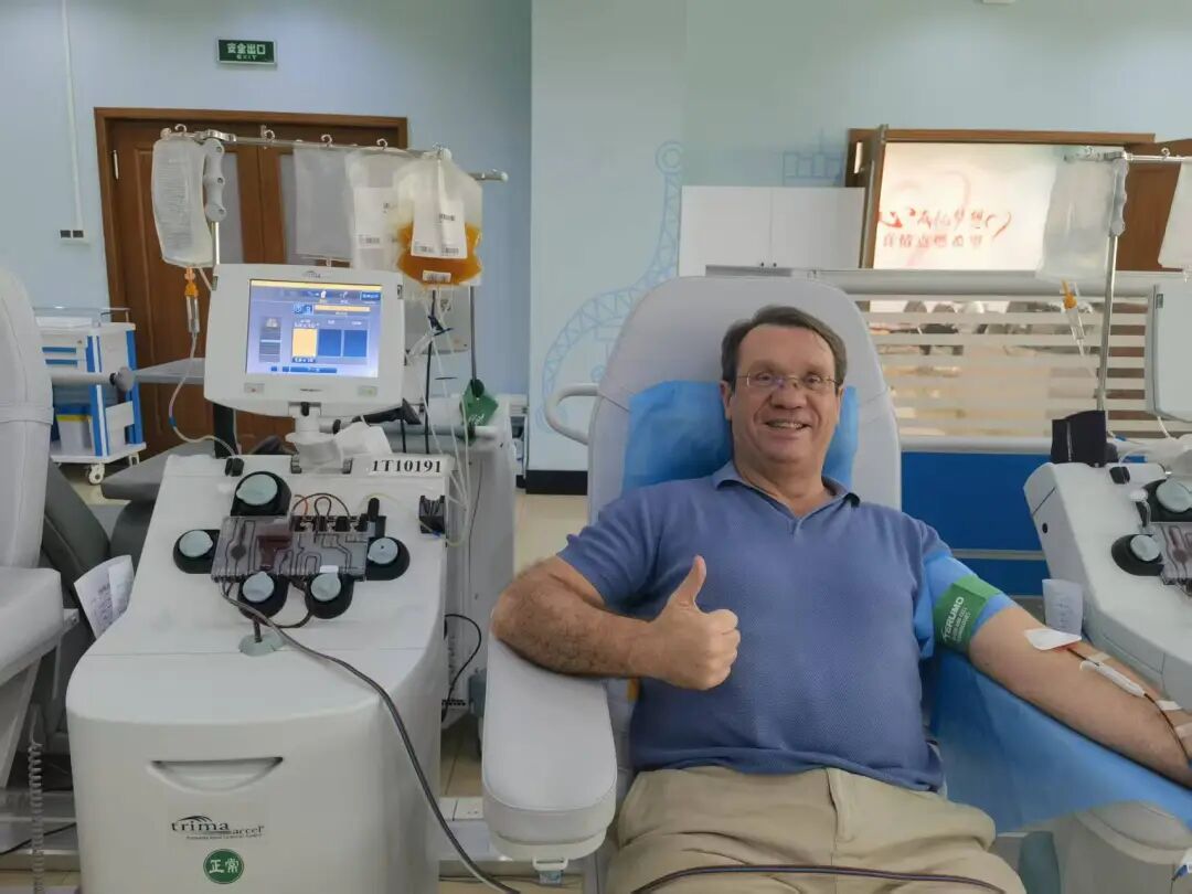 “我来天津32年了,从我来这里的第一天起,就觉得这个城市很好,这里的人太棒了,到现在这么多年一直没有改变。现在的天津已经成为一个国际化城市,基础设施发生了翻天覆地的变化。”皮安睿说。作为天津市人民对外友好协会理事,来自澳大利亚的皮安睿(Peter Mecoy)今年61岁,他坚持志愿献血已有17年。从2008年至今,他在天津每15天就主动参加一次献血,累计献血和血小板300余次,以治疗单位计算,相当于献血超过42万毫升,这是一个成年人自身血量的90多倍。熟悉皮安睿的人都亲切地称呼他为“老皮”,了解他献血故事的人送给他一个可爱的昵称——“熊猫侠”。“我是天津姑爷,我拥有‘熊猫血’,与天津结下了深厚的情缘和血缘之情,天津人就是我的兄弟姐妹。我献血是想呼吁大家多伸出援手,帮助更多的人。我虽然是外国面孔,但我有颗天津心。”皮安睿笑着说。