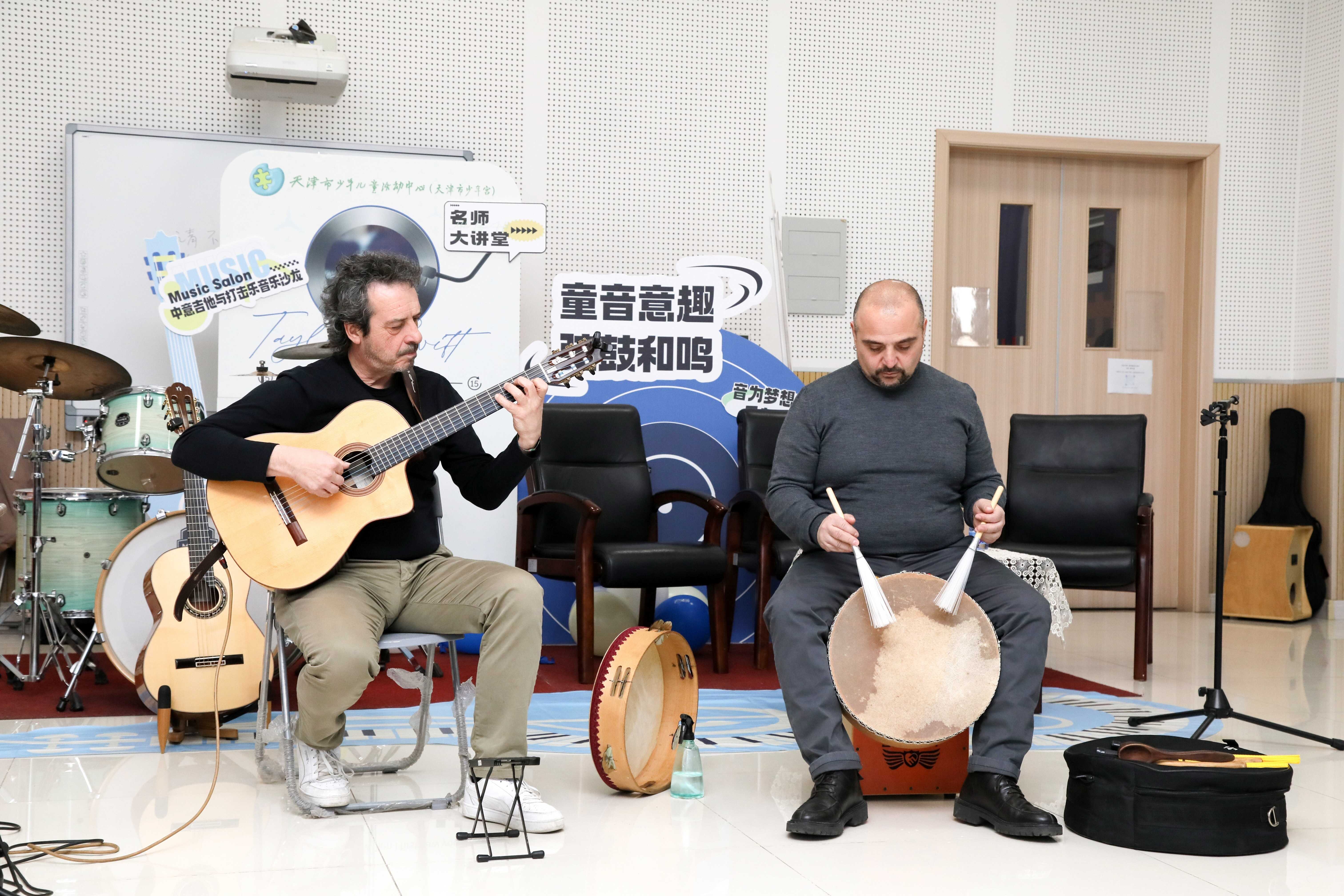 志愿服务队积极联络意大利音乐家与市少年宫举办“童音意趣 弦鼓和鸣——中意吉他与打击乐音乐沙龙”,在社区进行公益演出,以音乐为媒传递文化交融的独特魅力。