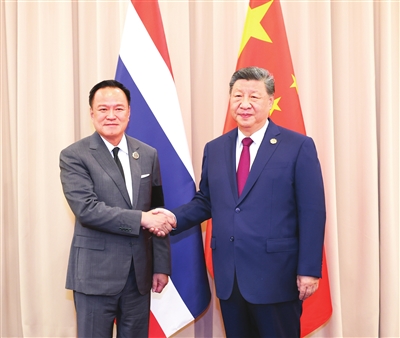 习近平指出,中国和泰国是好邻居、好朋友、好亲戚、好伙伴,常来常往、亲如一家。2022年11月我访问泰国,中泰关系进入构建命运共同体的新阶段,两国友好根基更牢、合作动能更强。今年是中泰建交50周年暨“中泰友谊金色50年”。站在新起点上,双方要继往开来,共同推动中泰命运共同体建设走深走实,助力两国各自现代化进程,为地区和平稳定和发展繁荣作出更大贡献。