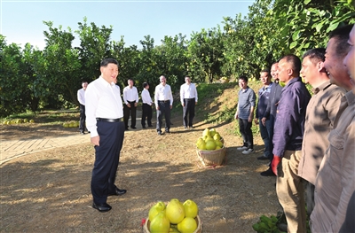 金柚是梅州的特色农产品。正值收获季节,柚子园硕果累累。习近平来到雁洋镇南福金柚种植基地,在展示厅听取广东加大对革命老区支持力度、推进乡村全面振兴等情况汇报,察看柚子及其加工产品、文创产品。他走进果林,同果农和农技人员亲切交流。得知今年金柚喜获丰收、销路畅通,习近平十分高兴。他指出,发展乡村特色产业是推进乡村全面振兴的基础,要加强科技应用,推动农文旅融合,不断延伸产业链、增加附加值,带动更多农民群众增收致富。