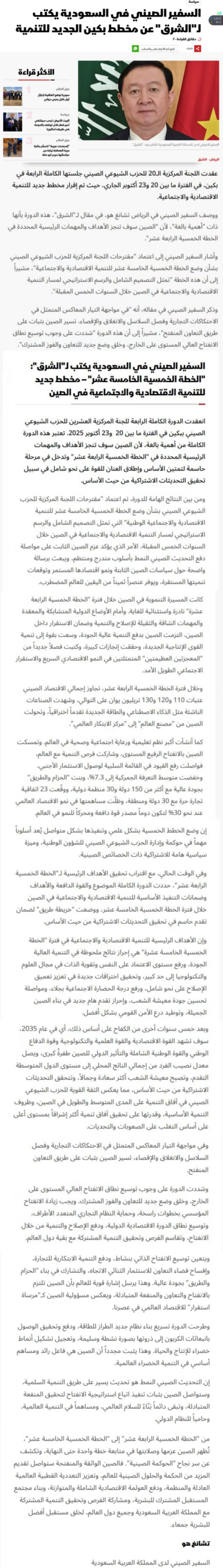 2025年10月26日,驻沙特大使常华在沙特主流媒体“东方台”网站发表署名文章《“十五五”规划——中国经济社会发展新蓝图》,全文如下: