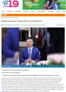 2025年12月22日,驻尼加拉瓜大使瞿瑜辉在尼官媒《19数字报》发表署名文章《共谋发展振兴 共创美好未来——中国政府发布第三份对拉政策文件》,全文如下: