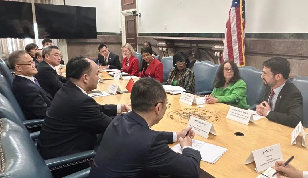4月23日,天津市委常委、常务副市长刘桂平率市政府代表团一行在费城市政厅市长内阁会议室会见费城新任市长谢丽尔·帕克,就进一步深化两市传统友城关系、加强友好交流与合作进行深入交流。中国驻纽约总领事黄屏出席会见活动。